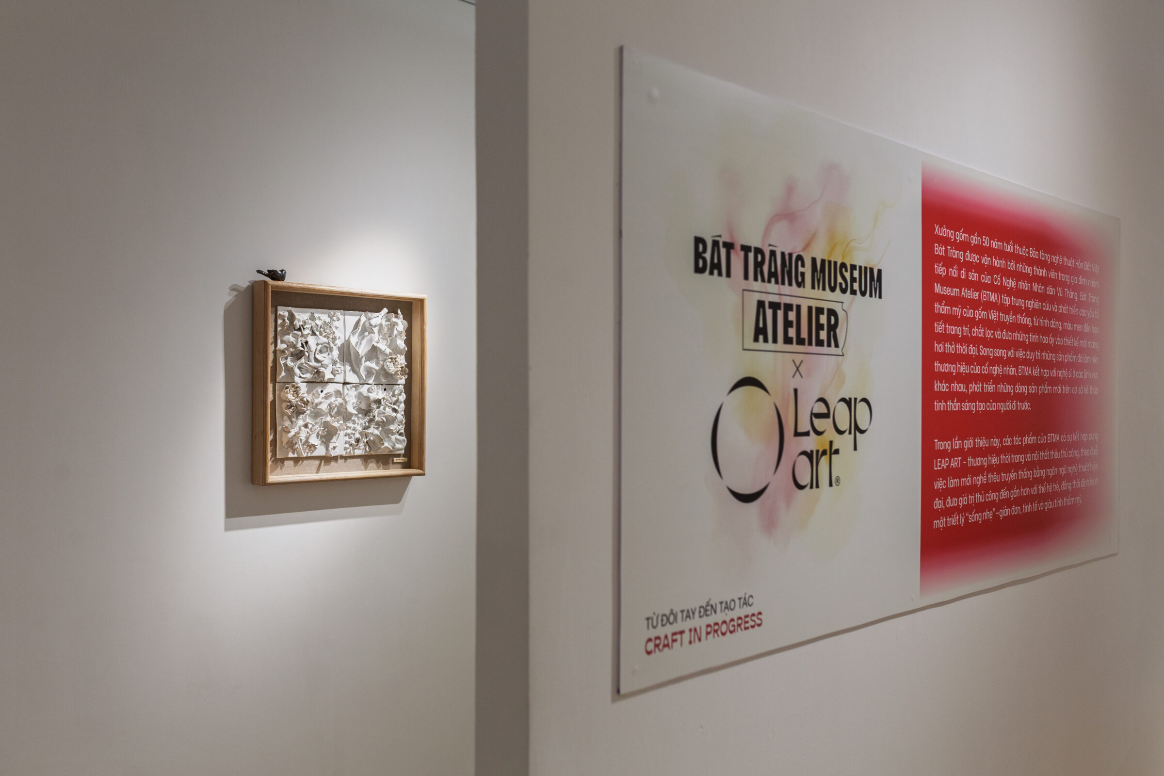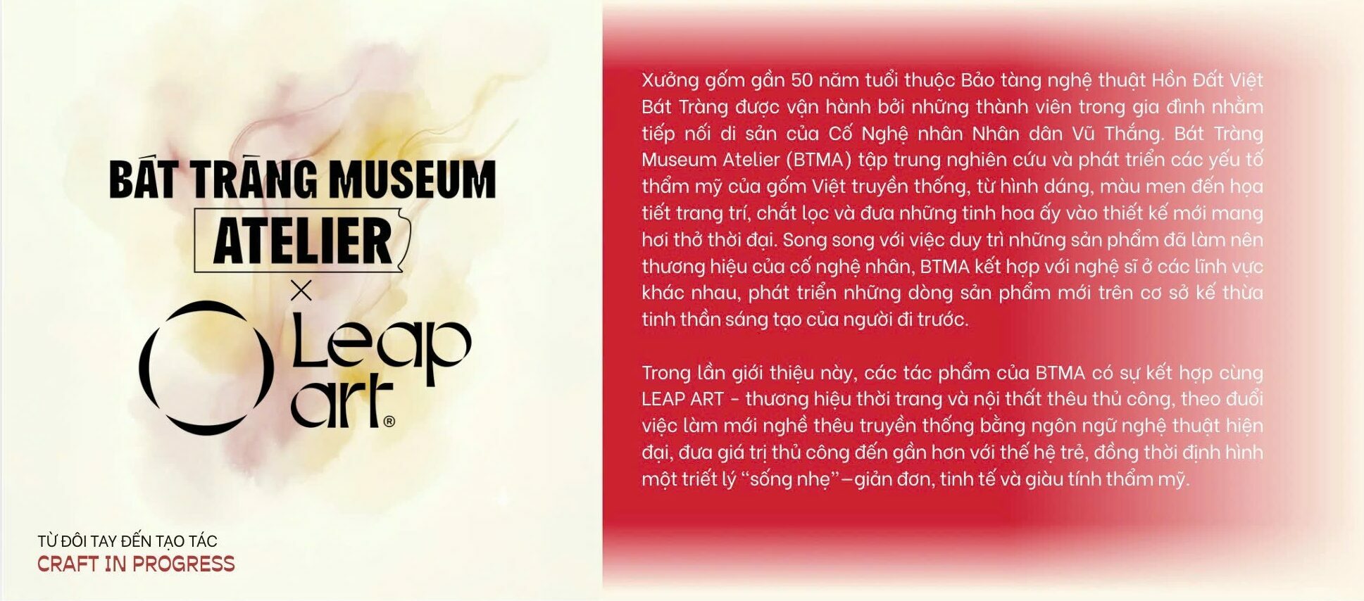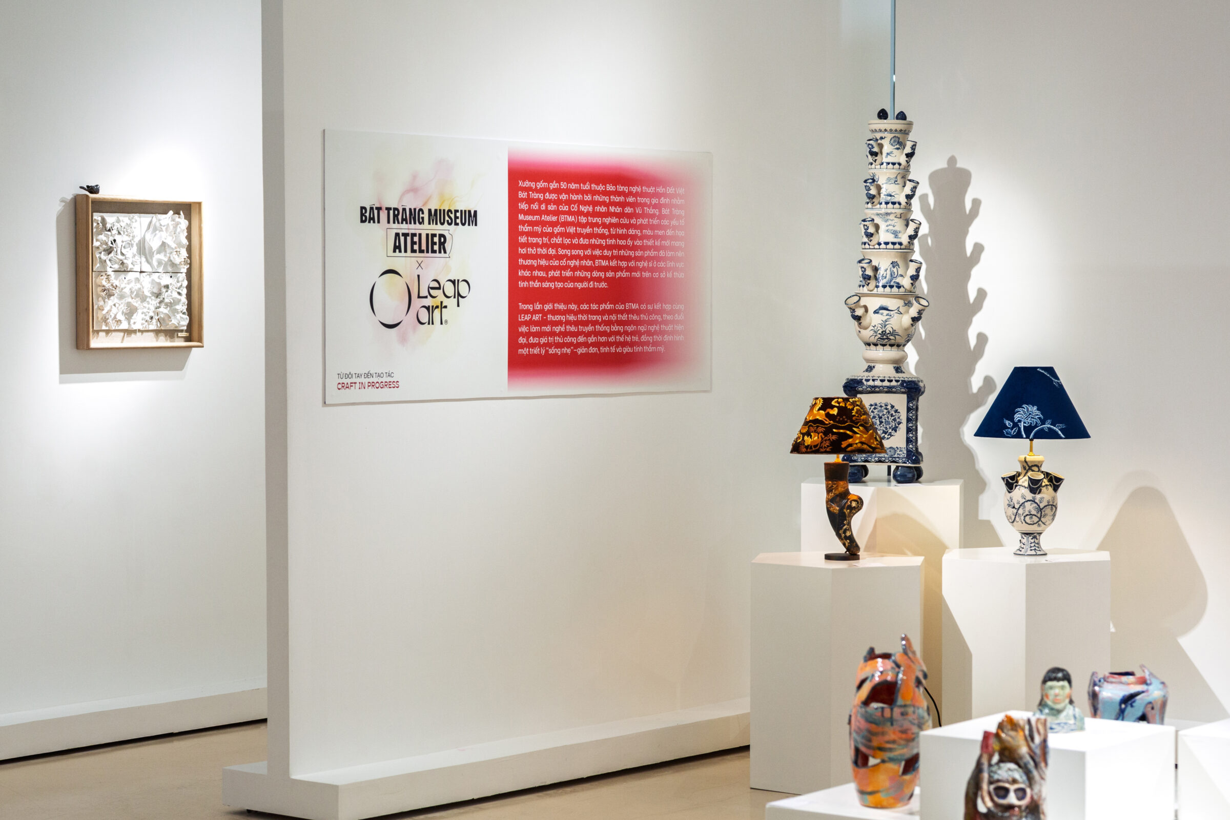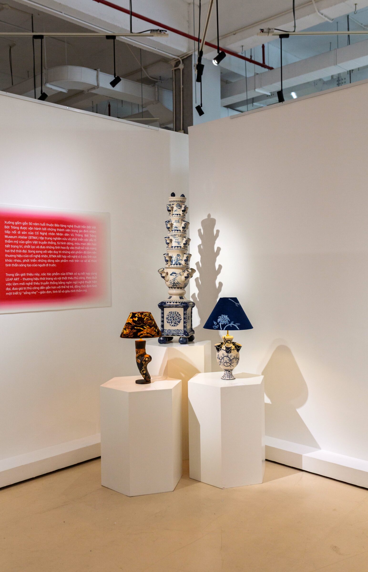 As part of the group exhibition Từ đôi tay đến tạo tác (Crafting in Progress) at Lotus Gallery, Bát Tràng Museum Atelier (BTMA) presents new interpretations of its signature works, developed in collaboration with the hand-embroidery practice of Leap Art Furniture & Decor.